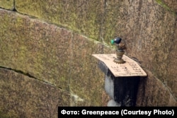 Российские гринписовцы надели противогазы на Георгия Победоносца и его коня в Москве и на Чижика-Пыжика в Петербурге.