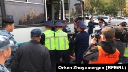 На глазах корреспондента "Азаттыка" полиция задержала девочку-подростка, когда она с мамой и двумя младшими сестрами шла в магазин. Сотрудники СОБРа посчитали, что она участвует в несогласованном митинге, и насильно занесли ее в автозак. Мать попыталась ее отбить.